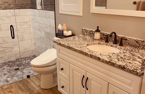 You will be comfortable in this spacious and unique property. Enjoy your getaway in this brand new guest house with lots of backyard amenities. Sitting on one acre with the main house you will have full access to a brand new pickleball court, playground, trampoline, fire pit, gas grill, Blackstone grill, outdoor dining table, yard games, pool and pool side seating! It has its own separate entrance for privacy and plenty of parking.