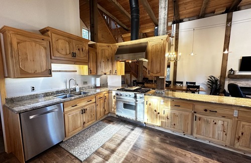 This newly remodeled cabin retreat has 4 bedrooms all with beautiful views, 3 bathrooms and is nestled in a private mountain side. It hosts the most incredible views of nature all around. Relax with the cozy, geothermal heated floors! Cook an incredible meal for a crowd in this fully stocked, large, gourmet kitchen. Enjoy time out on the heated concrete patio around the fire pit, roasting marshmallows and telling ghost stories. Cozy up with a blanket and a good book, or watch your favorite shows in one of the many relaxing spots around the cabin. There are 2 large living spaces with TV's to choose from. Have a blast while you sit around the large, custom made table playing games!