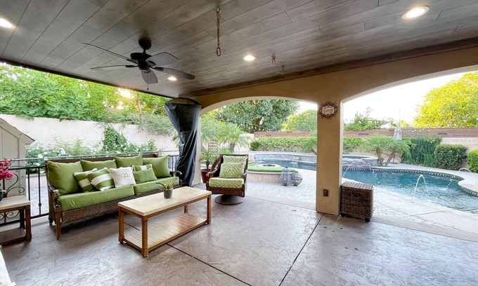 5 bed-3 bath, Fully equipped kitchen, work areas, board games and pool table, laundry room, TV with streaming for each room, outdoor kitchen, patio, pebble tec salt water pool with waterfalls and a 12'' deep play pool area, pool and spa color lights and string lights for night time entertainment, spa can comfortably sit 8 adults. One of the bathrooms has direct access to pool. Almost 12,000sqft property in the San Fernando Valley. Basic utility use included on this reservation, 90 min of daily use of jacuzzi FREE OF CHARGE, STANDARD FIRE PIT USE INCLUDED during winter time, POOL Can be heated for a fee. 20 min away from Universal Studios and only 10 min away from six flags magic mountain.
