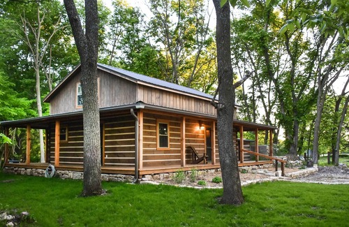 This beautiful vacation rental cabin near Elmdale, Kansas was completed in 2019 and is comprised of modern amenities along with remnants of an abandoned farmstead. The 1-bedroom, 1-bathroom 'Paw Print Cabin' has a loft for additional sleeping and sits on 40 acres of land— close to Cottonwood Falls— complete with access to Middle Creek where you can fish and bird watch. Fall in love with the peaceful Flint Hills while relaxing on the wraparound porch and enjoying time with your loved ones.