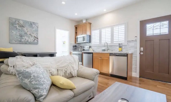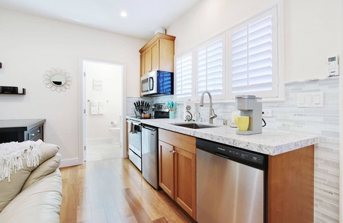 ****PRIVATE & SEPARATED GATED ENTRY W/ YOUR OWN SPACE: This is an *attached* unit but has it’s own private and gated entry. As this is a corner lot, the guesthouse was designed so that that unit faces a different street from the main house and therefore has its own separate and private entry. The yards are separated by fence as well. You will not walk by the main house and you won’t see anyone. You will have direct access to the unit.