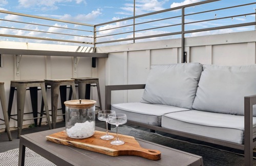 Stunning Rooftop Deck: The breathtaking rooftop deck invites you to dine under the stars or unwind in the hot tub with city views, providing the perfect backdrop for intimate gatherings or post-wedding celebrations.