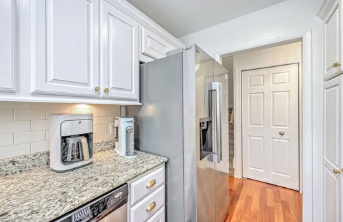 Upon entrance, guests step through the southern porch into a charming world of modern, crisp, coastal decor in a palette of soft blues, sandy beiges, blush pinks, and crisp whites. The cozy living area with vaulted ceilings, a decorative fireplace, large screen TV and ceiling fan, invites a relaxing atmosphere. The casual and refined aesthetic flows through the dining area with six French bistro chairs that seat six. A well-equipped kitchen provides everything you need to prepare delicious meals, making it easy to enjoy dining in. The kitchen area features stainless steel appliances, granite counterops, a garbage disposal, a standard coffee maker and a Keurig.