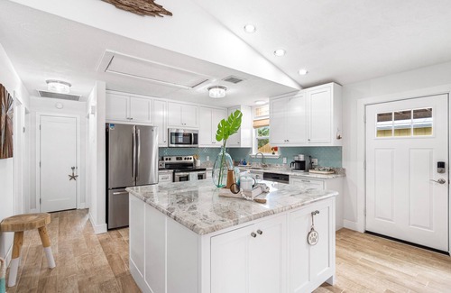 The outdoor space features a newly poured wide concrete front driveway and rear covered patio with ample room for parking and entertaining. New furniture, seating, lighting, a Weber gas grill and 65" Smart TV. Enough parking out front for 3 cars or a truck/boat combo and one vehicle. The driveway will comfortably fit boats up to 26' with truck attached. Perfect stay during Snapper Season! Our beach gear storage shed holds chairs, a beach cart, coolers, toys, skim boards, boogie boards and more all for your own personal use.