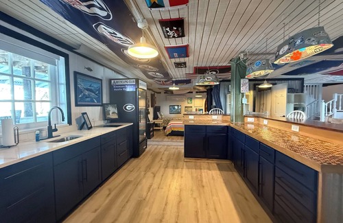 FIRST FLOOR: Sports Bar! The focal point is a custom-built bar with a bar top made completely from bottle tops! If you feel inclined, bring a small flag of your favorite team and we will be happy to tack it to the ceiling. 3 large screen TVs are available for sports fans or movie lovers. Check out our movie catalog if you’d like to go old-school. Are there gamers in your group? You’re welcome to hook up to our TVs.