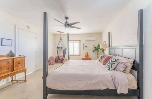 Adventure awaits at our spacious charming brick cottage sitting on over 3 acres. You’ll delight in the expansive views of the desert sunset, picturesque mountain ranges and the unobstructed blanket of stars. Perfect for couples, a small intimate group or solo travelers, our home has the amenities you’re looking for! Pet companions are also welcome. Our location is nestled a few short minutes from Joshua Tree National Park, 49 Palms Oasis and Downtown.