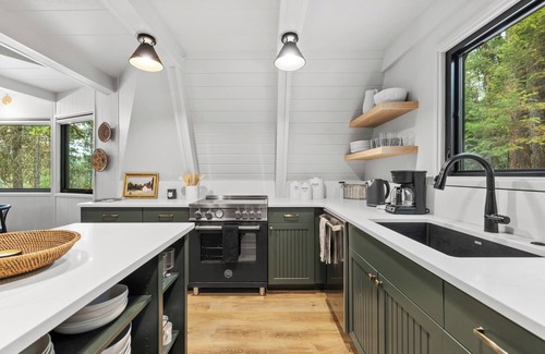 The gorgeous kitchen has brand new designer appliances, cabinets, counter tops, and everything else you need to cook a fabulous meal or just make a perfect cup of coffee or tea in the morning. Outfitted with all the amenities and cookware, the island sits 2 comfortably in addition to the 4 ft circular dining table nearby. During the summer the outdoor furniture is used a lot and seats up to 8 people. With windows on all sides of this classic A-frame, the designers wanted to keep some of the original features, such as the stunning stone fireplace with floating stairs. While not a mansion in the woods, this cozy 2 bedroom accommodates a family of 5 very easily – from dining options, to the couch and leather chairs in the living room where you can enjoy the 65” smart TV. Just beyond the deck is a newly built exterior firepit and seating for nature watching and stargazing, and with the perfect view through the trees of the river of course!