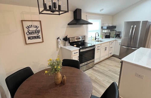 This brand-new, downtown river retreat is only steps away from great shops and restaurants, the Hollywood Casino and the Lawrenceburg Event Center. This private, two bedroom/1 bathroom unit is the perfect home away from home and sleeps 6. 2 bedrooms are identical in setup, including queen sized beds, luggage racks and a space to hang clothes. There is a pull out couch in the living room with linens. Outside of the unit is a nice sitting area with a table for four with an umbrella. Across the street is a green space/dog area with bags and garbage cans for dog waste.