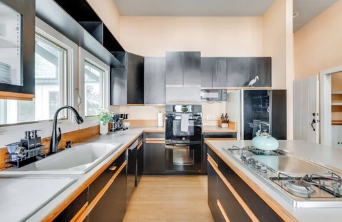 The property sleeps up to 12 guests and is perfect for families, friends, or special gatherings. Inside, natural light pours through expansive windows, highlighting soaring ceilings, warm wood details, and thoughtfully crafted spaces designed for relaxation and connection.