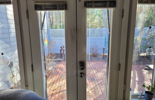 Located on the "Dunes" golf course of New Seabury, this sunny air-conditioned family friendly vacation home faces Mashpee Wildlife Refuge with walking trails out to Fly Pond. First floor features private fenced in brick patio with table and chairs, gardens and grill, fully equipped kitchen, living room with wall of windows and double door opening to brick patio, decorative fireplace, Smart TV and comfy seating for lounging. Dining area includes table with folding leaves and seats 6. Second floor features Master suite with king bed, full bath, and smart TV, and private guest bedroom suite with queen bed and full bath . First floor features studio/office room with a queen sleeper, double doors opening to outdoor brick patio, Smart TV and desk and chair. Fully equipped kitchen with dishwasher and microwave, third full bath on the first floor. Also included: smart TV with cable and Comcast Wifi.