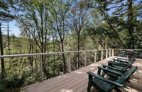 This cozy, secluded cottage with great views is adjacent to Half Mile Farm and includes deeded access to Apple Lake which is a short stroll away. Downtown Highlands and its renowned restaurants, shopping, and small-town charm is just two miles away. With 4 bedrooms, 3 bathrooms, and 2 fully equipped kitchens, this property accommodates 8 guests. Relax on the serene 3 level deck with views, unwind in front of the wood-burning fireplace, or enjoy one of the many outdoor activities in Highlands.