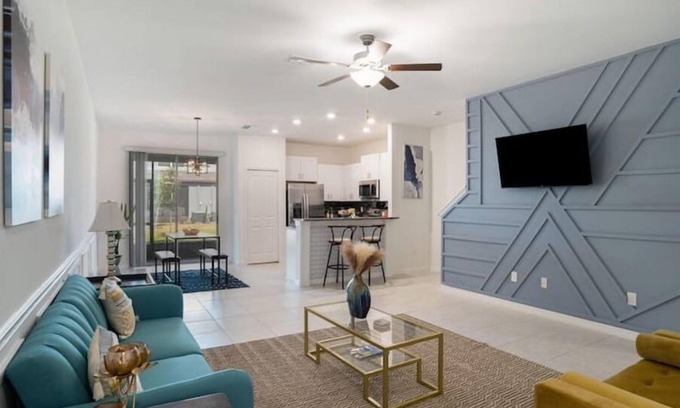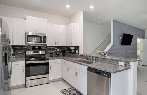 This stylish new 2023 build gated property is perfect for travellers that appreciate aesthetic style and comfort. Welcome to this spacious two-story eye-catching townhome with contemporary open floor layout. Downstairs is modernly and beautifully decorated with new furniture, abstract accent wall and stainless steel appliances. Covered and screened-in patio for outdoor relaxation and shielding from mosquitoes. 3 beds,2 bathrooms, loft, and laundry room upstairs. Access to community pool.