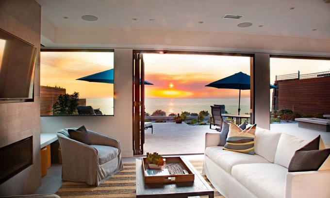 Bathe in the natural sunlight in this amazing open-plan space just above the ocean. The deck offers panoramic Pacific vistas, with retractable doors that allow the indoors to become outdoors and vice versa. Enjoy indoor and outdoor fireplaces/firepits and entertainment options, together with touchscreen appliances. Relax into the two bedrooms and 2.5 baths. You're here: on the ocean, and by the tranquil bustle of the Solana Beach town with its shops, cafes, wine bars, breweries, live music, unique shops and very own train station. You won't want to leave. Two beach accesses in the neighborhood are just a 1-minute walk away with Fletcher Cove Park to the south and a 3 minute walk to Tide Park to the north. Of course all the beach essentials are waiting for you in the garage.