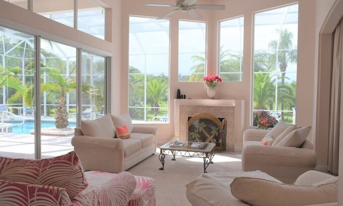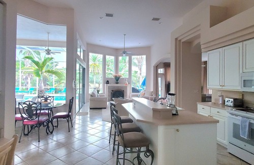 With 18 foot ceilings and over 3200 foot square foot outside covered patio area with a pool enclosure. The inside of the home has a fireplace in the living room area with 2 couches and 1 large armchair with ottoman.The family room has another 2 couches to sit and relax and with a view to the pool area. Off of the living room is a large flat-screen TV 63 " along with a circular couch to relax and watch a film or TV together. We have a DVD library with all types of films along with a lot of movie channels.
