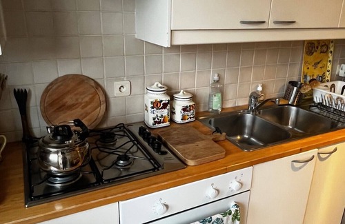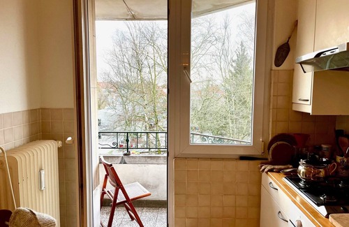 This lovely flat is on 3rd level with green views. Enjoy a 4 meter long balcony in back, entrances from both bedrooms. Great amenities: elevator, good WiFi, kitchen pantry, microwave, secured w/ a reinforced door, parquet floors, lovely furniture + rugs. Only one apt on each floor of this building! And you'll find everything you need for cooking.