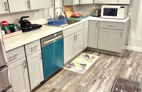 The kitchen includes a large island perfect for dining, drinks, or casual conversation. Enjoy the convenience of a full-size refrigerator, dishwasher, microwave, coffee maker, small 2-burner stove, cooker, and toaster — everything you need to feel right at home. We also provide pans, plates, bowls, utensils etc to prepare and enjoy your meals. Plus, a small size but cute pool table adds a touch of fun and entertainment to your stay. A separate bar if you want to enjoy drinks, wine etc. A tower fan and small heater are provided for your comfort with A/C and heater shared with the main house, and can’t be controlled from this space but we maintain thermostat at 70F during winters and 73F during summers.