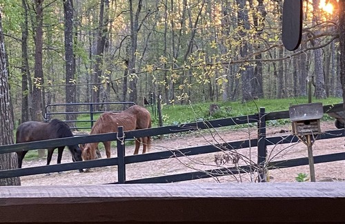 Cute bunkhouse (300 sq ft) with horses just outside the door. one small dog welcome. . Beautiful well kept property very peaceful and quiet. Great outdoor fire place to enjoy a meal and the horses. Walking trails and County Park nearby with trails, playground and multi use building for kids/adults. Pet friendly for one approved dog on leash at all times.