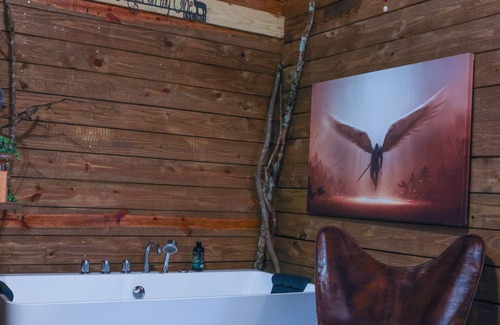 Small bunkhouse with jetted soaking tub, bathroom, mini frig, sink and firepit area. Electric outside grill and hosts on site. We can interact or leave you alone. Any dog must be on leash at all times when outside. Guests have access to outdoor fireplace area and horses.