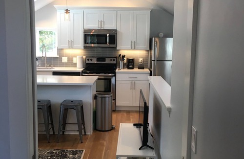 Our Cottage sleeps 2 people. You’ll find a queen sized bed in a private room that closes off with a solid wood pocket door. Please keep in mind the cottage is only 550 square feet and could be tight for some people (I.e. when considering luggage storage), but completely doable. The closet in the bedroom is large and there is also some storage in the bathroom/laundry room. Some travelers may find the space is too small for their liking. The cottage does have an interior set of stairs as the main living is on the upper floor. The bathroom is on the first floor allowing for privacy. Could possibly be a concern for younger travelers not accustomed to stairs. Stairs are nicely illuminated with stair lighting. Flat screen TV w/cable and Wifi included. Children books, toys, high-chair and Pack-n-Play available upon request. Street parking is available.