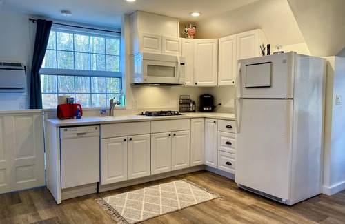 Enjoy Vermont living in this stylish and chic loft style studio just 1.5 miles from the charming village of Stowe. This newly appointed space has everything you need for a relaxing getaway. Comfortable living area, king size bed, dining table and kitchen with stove, microwave/convection oven, dishwasher and more. Relax in the jetted tub after a day on the slopes or trails, and it convientntly has a washer/dryer on site. Mt. Mansfield is under 10 miles away and hiking trails including Pinnacle and Kirchner Woods are just around the corner. Located on the second floor of a newly constructed "barn" on a country road surrounded by woods and overlooks a lovely pond.