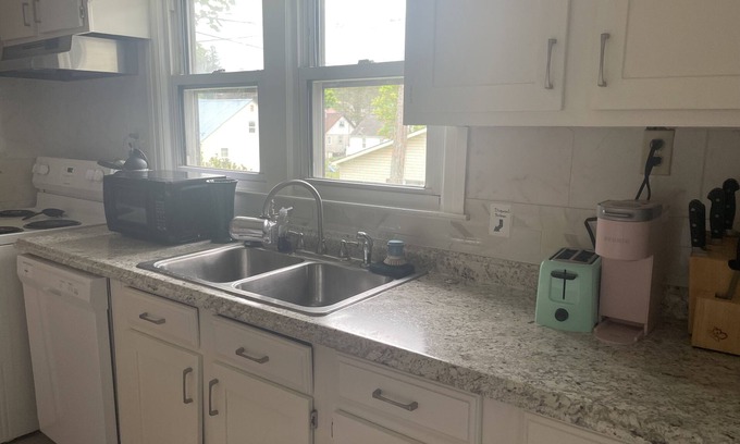 Kitchen: new appliances, dishwasher, garbage disposal, electric stove, wine glasses, Keurig with refillable cartridge, dining room table,
