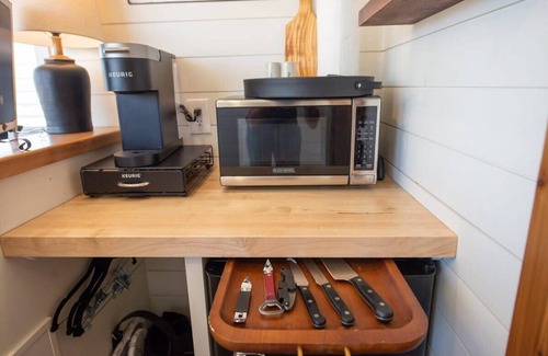 This tiny house has all the amenities of an upscale hotel room yet with unique and exquisite design and decor. A queen size bed with a super-comfy Tuft & Needle mattress will help you fall asleep fast. A full size shower and bathroom is snuggled into the back of the unit and has endless hot water! For your morning coffee a Keurig and K-cups are provided along with a microwave for heating up your popcorn in the evening. Climb up to the rooftop deck for stargazing or your morning coffee.