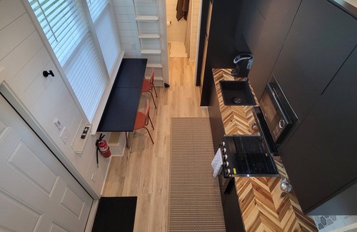 Our tiny is clean and bright. It has a large, well equipped kitchen Double loft sleeping area with queen sized beds. Couch folds out into a full size bed for those needing first floor living. Large, bright and clean bathroom. Mini split keeps the tiny cold in Texas heat.