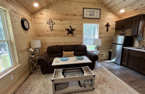 Unplug & unwind at this newly constructed unique and tranquil getaway. Enjoy the view from amongst the pines from the tiny house front porch. Quiet country area that is just 8 miles north of Paris and 14 miles south of the Casino. Please add your pet to your travelers if they will be traveling with you. There is a non refundable pet fee required for 1 pet. If you would like to bring more please let me know and we will work out a different fee.