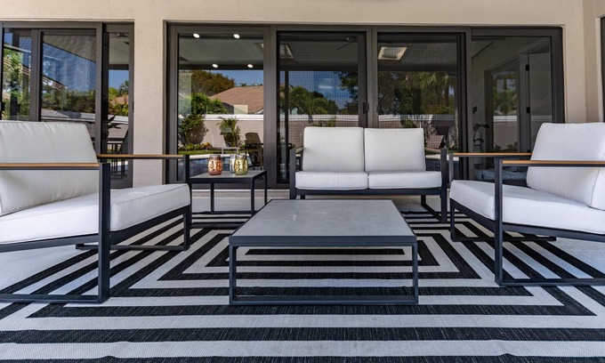 Exquisite newly renovated open floor plan home with rare oversized corner lot bordering additional HOA land for added privacy. 4 hole raised putting green, synthetic grass in back yard,. Pool has been rebuilt with 2 fountains, diamond bright bottom, LED lighting system with eight different color choices, new tile and filter. New UV light installed on A/C which has been relocated from Loft/Attic to garage . Huge kitchen island. Kitchen aid and Bosch appliances. Touchless faucet in kitchen. Ultra quiet 48DB dishwasher. Oversized shower in Master with 3 shower heads. Seamless glass shower walls. Bluetooth exhaust fans in bathrooms with cool blue night light settings allows you to play music in baths. Rare Italian porcelain tiles throughout. New Impact Resistant CGI doors and windows. Pool heating and cooling system. Beach chairs and umbrella included. Community tennis and basketball courts.