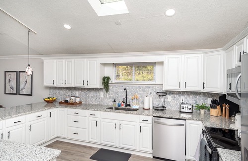 The spacious kitchen comes equipped with all the essential appliances, utensils, and cookware to make you feel right at home. We've got you covered with kid-friendly items and plastic ware. The kitchen offers a versatile Keurig coffee maker that can also accommodate ground coffee, a French press, and a variety of tea options.