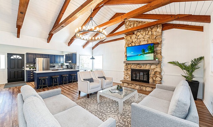 The vaulted ceiling family room is a great gathering space with plenty of seating and it features a new 65" Roku TV in guest mode, allowing you access to your own account for any TV subscriptions you already have at home.