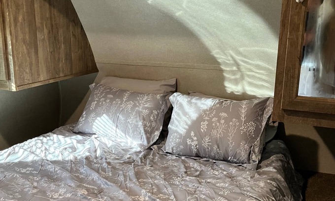 Trailer is updated--larger, 3 slideouts, upgraded, comfortable furnishings; pictures don't reflect this yet; Comfortably sleeps 2-3; Still a cozy space with the amenities of a house; Comfortable after a long day; peaceful, rural, private setting that is gated and offers free parking. Eating table can double as a work space. 1 large smart tv.