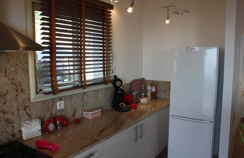 in granite, 4-burner gas hob, electric oven, fridge-freezer, dishwasher.