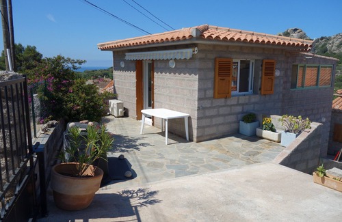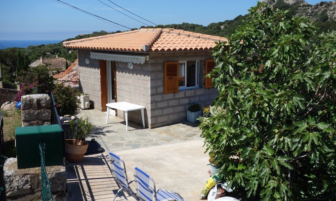 On leaving the village, quiet, not overlooked, heated new building on 2 shots, with terraces, small garden, sea view and the surrounding mountains (Omu di Cagna, possibility of hiking), parking and restaurants .Commerces very short walking distance. .