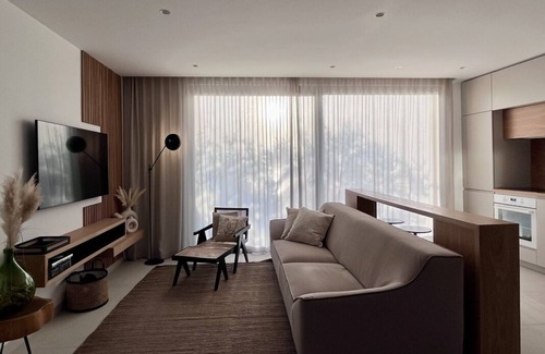 The interior is designed in a modern language but still gives preference to warm tones and natural materials. Sharp details, black color, and metal contrast with wood and rattan creating a pleasant space to stay and relax. Great attention is paid to details and pieces of designer furniture.
