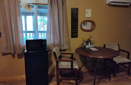 Each of the cabins have their own unique style! Four of the cabins (#1 ,#5, #10, and #12) have bedrooms and the other two (#9 and #11) are "studio cabins". The bedroom in Cabin #5 is explicitly set-up for younger children. Each of the cabins have their own private bathroom with a toilet and a shower or bathtub / shower combination. Cabins #1 and #5 each have a combination bathtub / shower and the other 4 cabins (#9, #10, #11, and #12) have showers. Cabin #11 is explicitly set-up to be wheelchair accessible. (Please note that it is still necessary for guests in wheelchairs to travel approx. 250 feet from the parking area to the cabins.) All of the cabins have a small "kitchenette" in them that consists of a sink, mirror, countertop, and coffee maker. (There are no sinks and mirrors in the bathrooms.) Ground coffee and filters are provided as well! Each of the cabins also has a small dining table and 2 chairs.