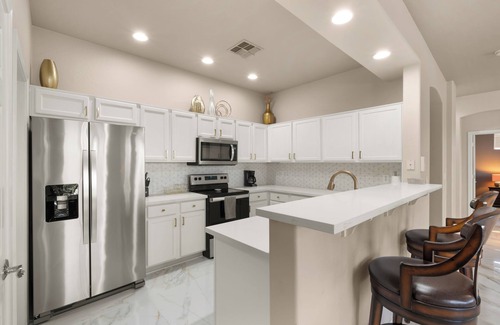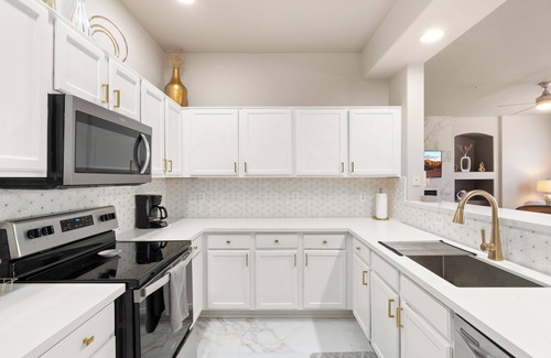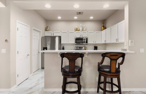 This stunning villa features brand-new glamorous flooring, pristine white cabinets adorned with Champagne gold pulls, and elegant Quartz countertops. Enjoy the sophistication of stainless steel appliances, a marble backsplash, tiled showers and baths with Quartz counters, sinks, and Champagne faucets.