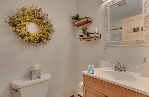 BATHROOM: shampoo, bar soap, body lotion, hand soap, towels, toilet paper, hair dryer provided.