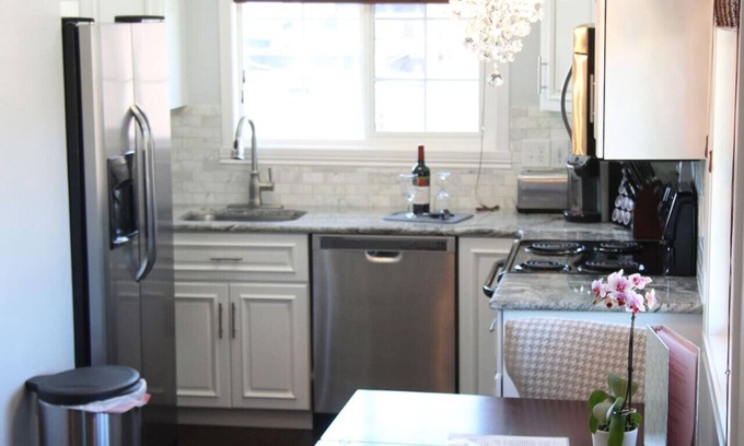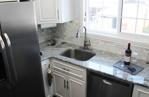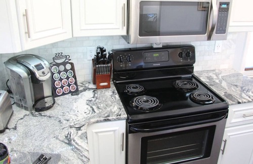 Stunning! This luxurious condo was completely remodeled in 2015. The entire bedroom has a new furniture with a new king bed as December 2018. of This open-concept condo has all the high-end-finishes including eye-catching granite countertops, heated tile flooring in the bathroom, a sparkling chandelier over the dining room table. Free Wifi is included and covered carport parking. The bedroom is your own private oasis with a mounted flatscreen smart TV (with Netflix) and a small balcony. The condo is one bedroom but it sleeps four because of our LazyBoy sleeper couch featuring the SlumberAir mattress system. It's a four inch mattress pad with a built in six inch air mattress, rated the most comfortable sleeper couch available! Other amenities include full kitchen, Keurig coffee maker, air-conditioning, electric fireplace, two flatscreen smart-TVs, keyless entry front door and coin-op laundry in the building (bring quarters and nickels). We have more condos in the building so let us know if you need more space. There is some construction next door which should only cause noise during the day.
