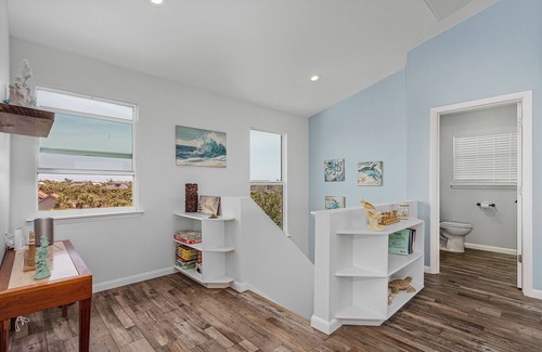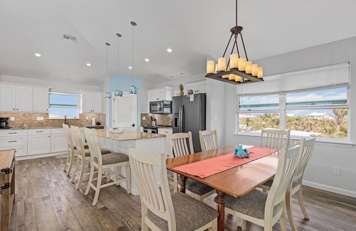 The upper level living areas are fully surrounded by screened decks. Enjoy a private lunch or take a nap in one of the chaises with just the sound of birds and surf to keep you company. The well-equipped kitchen features granite counter tops, bar seating and a dining room table. The kitchen and dining area flows into the great room with plenty of comfortable seating and a 55inch flat screen TV, perfect for relaxing after a hike in the nature preserve.