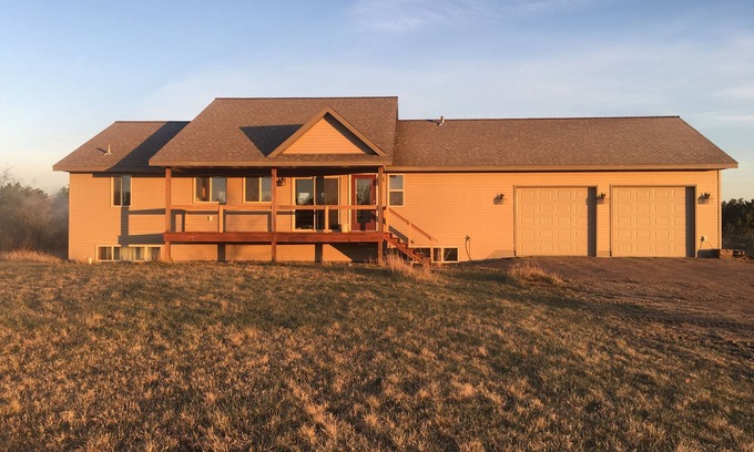 Modern and spacious home with air conditioning and queen size comfortable beds for a great nights sleep. *There are blinds on all bedroom windows.* There is a fire pit and bbq grill for your use. Easy access to the entire surrounding lakes area. 5 minutes to hospital and 3 minutes to airport. Amazing panoramic views half a mile down a private drive with abundant wildlife all around. Quiet, peaceful and relaxing. Watch the sunrise and sunset from the decks. Only 20 miles to Itasca State Park:)