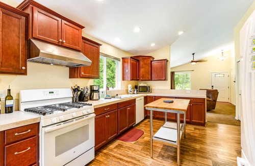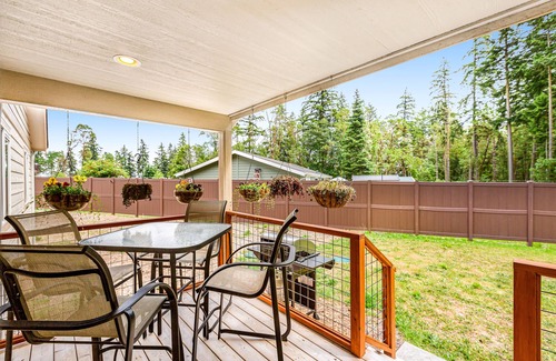 Built in 2016, this single-story home offers the polish and ease of new construction with windows that frame the old-growth forest outside. Come home from your daily excursions to recline by the TV in the light-filled living room, prepare snacks and appetizers in the spacious kitchen, or head outside to the covered back patio for a barbecue dinner on the gas grill.