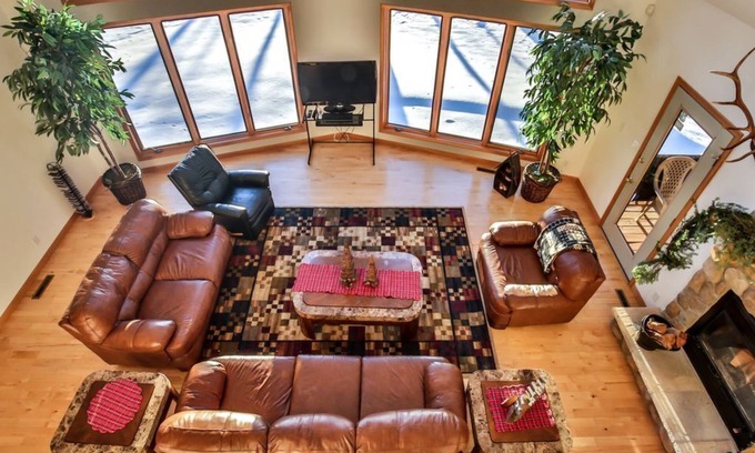 - Relaxing Gatherings: The inviting great room boasts cathedral ceilings and a wood-burning fireplace, creating a cozy atmosphere for after-party celebrations or quiet moments with family.