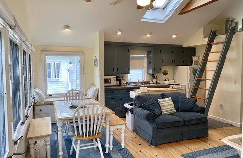 Summer vacation is at its best in this beautiful Newfound Lake waterfront cottage. Windows are everywhere for gorgeous views of the lake and there is even a comfy window seat for you to read a book or look out at the lake while you sip your morning coffee. There are two bedrooms; 1 queen in the master and 1 set of twin bunkbeds in the second room. A spacious loft has another 2 twins that can be used as separate beds or put together to make a comfortable king.. An ingenious retractable ladder. provides access to the loft. The cottage sleeps 6 but # of adults is limited to 2.