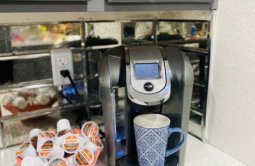 Fully equipped! Electric range, dishwasher, pots / pans, dishware / flatware, spices / oils, and Keurig with limited K-pods and creamer.