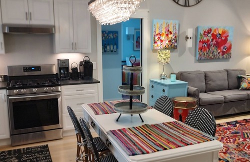 Camellia Cottage was designed to look like it had always been part of the estate; with architectural details that mirror it's mother property in accordance with the historical district's guidelines. Decorated in a midcentury French genre, the original art was collected during the owner's travels to complement an eclectic mix of vintage and modern furnishing. Step inside, however, and you experience the ambiance of contemporary features including a cathedral ceiling in the family room, built-in large screen TV and desk/bookshelf units in each bedroom. Every room offers a visual vista of mature foliage and gardens, unhampered by large paneled plantation shutters.