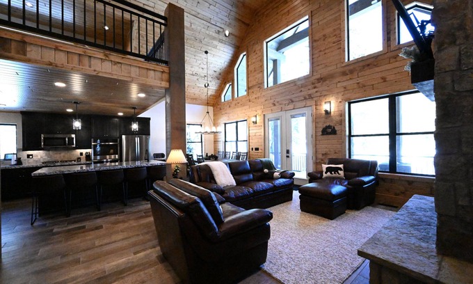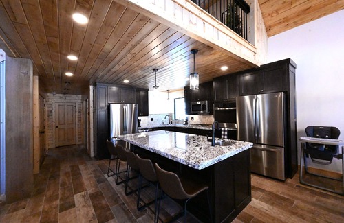 This stunning cabin features five spacious bedrooms and four modern bathrooms, ensuring everyone has their own comfortable sanctuary after the festivities. The expansive gourmet kitchen is equipped with two refrigerators, a double oven, and ample dining space, allowing you to easily cater to your wedding party. Relax and unwind under the stars in the private hot tub or around one of the two outdoor fire pits, creating the perfect ambiance for intimate moments. With entertainment options like a pool table, ping pong table, and multiple TVs equipped with streaming services, there is no shortage of fun for your guests before or after the big event.