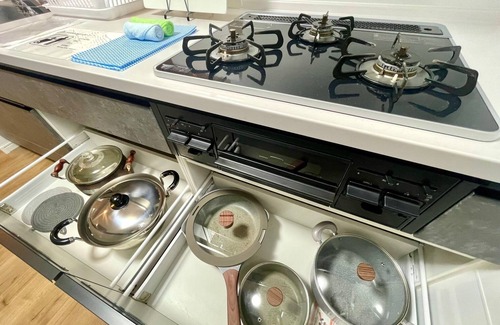 The living room is equipped with a sofa and a 55inch large TV and the kitchen is fully stocked with new home appliances and cooking utensils so that everyone can relax