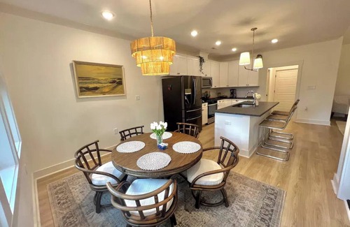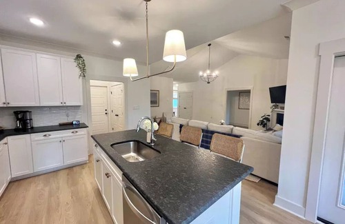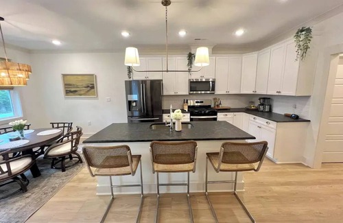 Experience the luxury of our newly built beach house, featuring three beautifully designed bedrooms that comfortably sleep up to nine guests. Gather in the expansive living room on the large sectional couch or enjoy meals in the fully-equipped chef’s kitchen adorned with granite countertops and a gas stove. Our amenities ensure your stay is filled with comfort—take advantage of high-speed Wi-Fi, Smart TVs, two bikes for easy beach access, beach chairs, umbrellas, and towels. Unwind outdoors on the screened-in porch or enjoy the large yard, perfect for outdoor activities during your wedding festivities.