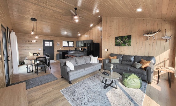Relax and enjoy this newly built modern and cozy cabin nestled on the south facing shores of Jessie Lake. Unwind and soak in the tranquility the lake life has to offer in this one level 1250 sq ft, 3 bedroom, 2 bathroom cabin that easily sleeps 9. Enjoy a level walk to the lake with over 100 feet of shoreline. This year round, dog friendly, cabin has a contemporary vibe with modern amenities to elevate your stay.
